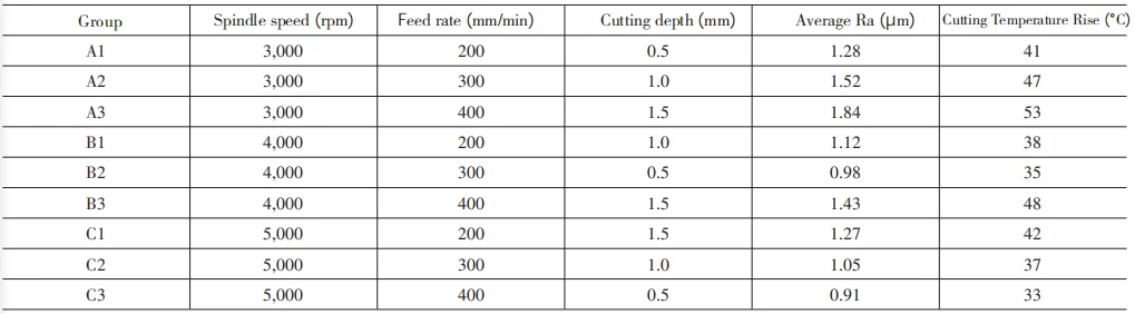 Researchers set three factors—spindle speed, feed rate, and cutting depth—using a three-level orthogonal design to produce nine test combinations.