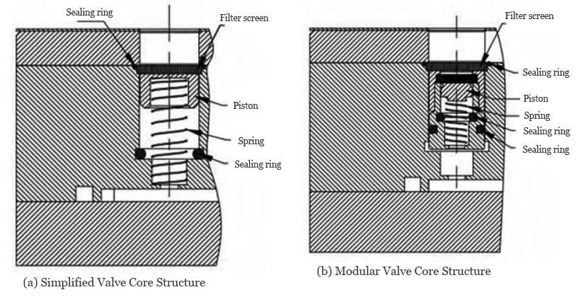Figure 2(b) illustrates a modular valve core structure, which operates similarly to the simple valve core but involves higher machining complexity.