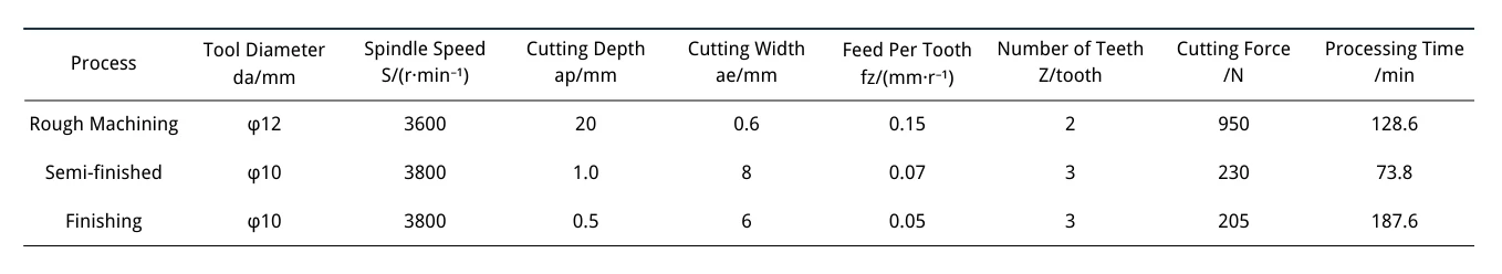 Calculate roughing, semi-finishing, and finishing cutting forces and machining times using empirical cutting force formulas. Specific parameters are shown in Table 1.